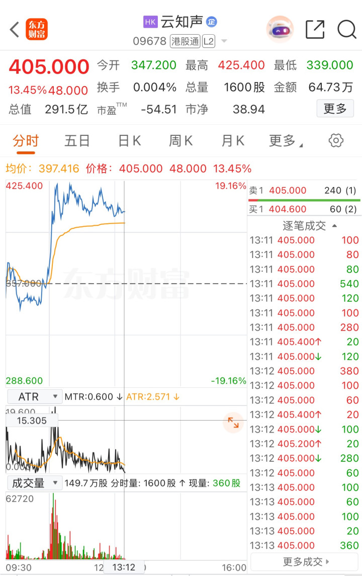上证报中国证券网讯(林铭溱记者刘逸鹏)2月2日,云知声早盘低开,随后冲高回落,盘中一度涨超19%,最高报425.4港元/股。截至13时12分,云知声涨13.45%,报405港元/股。